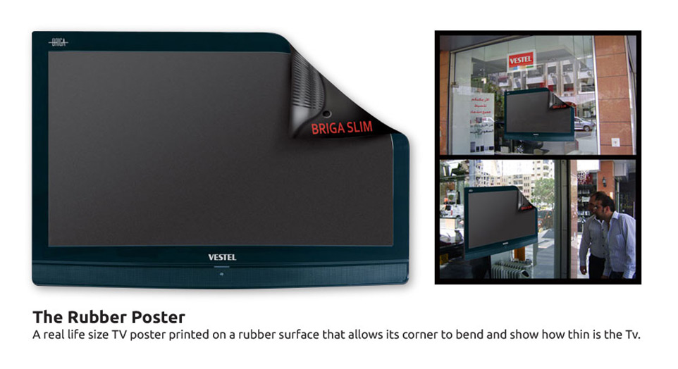 We placed a real size TV poster in cinemas, malls and electronic outlets across pan Arab countries, the edge of the poster was left without any adhesive allowing it to bend and hence address the idea of slimness to the Vestel LED TV screens . In addition, activation programs were implemented across various outlets to increase engagement with the campaign concept.